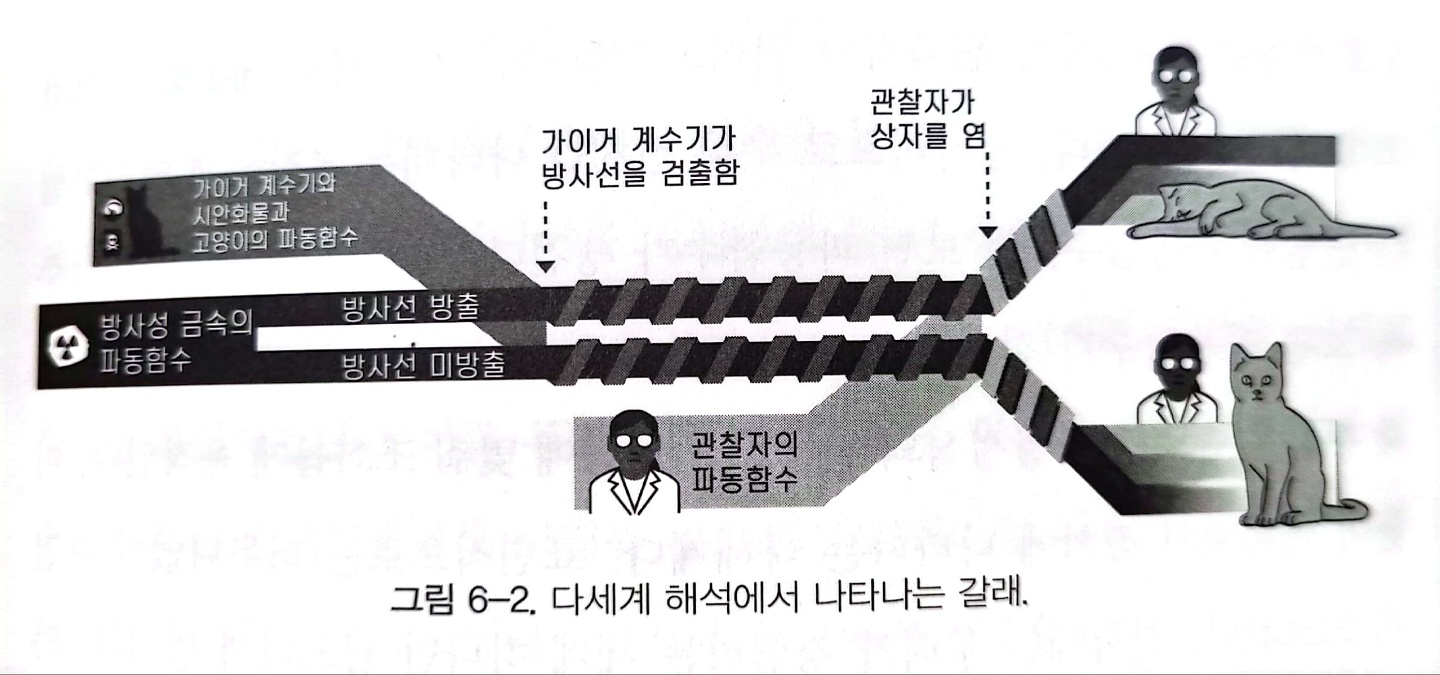 독립된 계로 존재하는 상자 안에서는 고양이가 죽었을 수도, 살아있을 수도 있습니다. 책에서는 한쪽 부분에서는 방사선이 방출돼서 고양이가 죽었고, 다른 한쪽에서는 방사선이 미 방출되어 고양이가 살아있다고 말하고 있습니다. 이제 상자를 열면 코펜하겐 해석에 따르면 측정에 의해 파동 함수가 붕괴되어 하나의 결과가 발생한다고 한다. 에버렛은 여기서 하나의 결과가 나오는 것이 아니라 다세계 해석에 의해 갈래가 나뉘어 하나의 결과가 발생한 것이라고, 관찰자도 둘로 갈라진 것이라고 주장하였다.