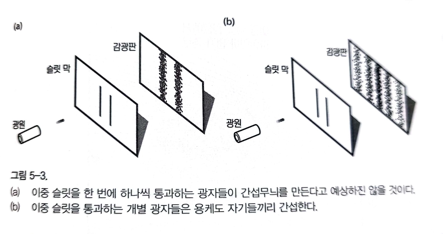 이중 슬릿 실험은 물질의 파동성과 입자성을 알아보기 위한 실험으로 두 개의 미세한 구멍 사이로 물질을 통과시키면 파동인지 입자인지를 알 수 있다는 실험입니다. 파동은 회절(장애물의 가장자리에서 휘어져 나오는 현상)과 간섭의 성질을 가져 간섭무늬가 생기지만, 입자는 간섭 무늬가 생기지 않는다는 것입니다.