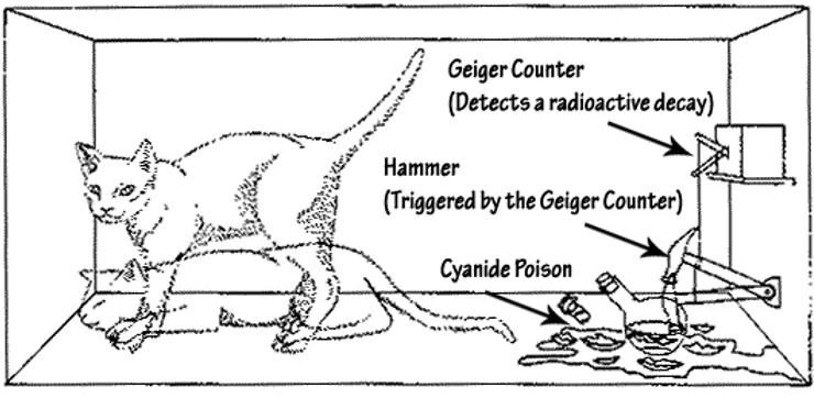 한 마리의 고양이가 (외부의 간섭을 막을 수 있도록 고안된) 무시무시한 기계 장치와 함께 철로 된 방에 갇혀 있다. 그리고 그 기계장치 안에는 한 시간에 한 개의 원자만이 붕괴할 정도로 아주 미소한 양의 방사능 물질을 담고 있는 가이거 계수기(방사능 측정 장비)와 함께 청산가리가 든 병이 놓여 있다. 만약 하나의 원자가 붕괴하면, 그 계수기는 작동하면서 작은 망치를 움직여 청산가리가 든 병을 때리게 한다. 누군가가 한 시간 동안 이 전체계로부터 떠나 있었다고 하자. 그는 만약 어떤 원자도 붕괴하지 않았다면 그 고양이는 살아있을 것이라고 말할 것이다. 반면 최초의 원자 붕괴가 있었다면 그 고양이는 독살되었을 것이라고 말할 것이다. 이 경우 전체계의 상태 함수 Ψ(프사이 psi, 파동 함수를 표현하는 문자)는 죽은 고양이와 살아있는 고양이를 동등한 부분으로 포함하는 것으로 표현될 것이다. 이러한 예들의 전형적인 특성은 (양자역학의) 미결정성이, 원자적 수준에서 직접적인 측정에 의해 결정이 가능한 거시적 수준으로 옮겨간다는 점이다.